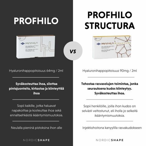 Vaikka sekä Profhilo että Profhilo Structura perustuvat bioremodellointiin (ihon uudistuminen luonnollisesti stimuloimalla kollageenin ja elastaanin tuotantoa), niiden vaikutusalueet eroavat toisistaan huomattavasti.