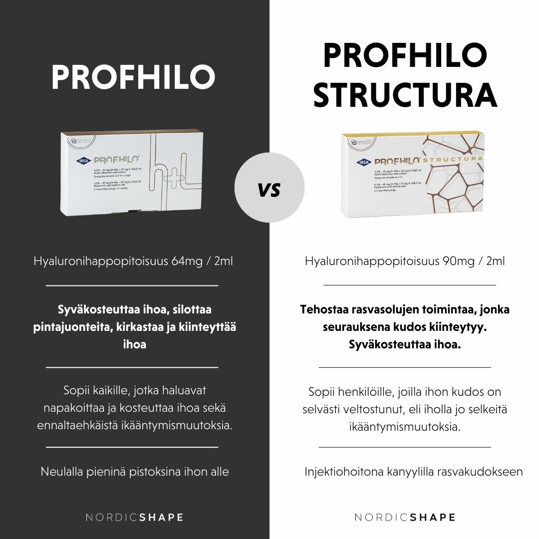 PROFHILO keskittyy enemmän ihon pintakerroksiin. Se kosteuttaa ihoa syvältä ja parantaa sen heleyttä, samalla kun se stimuloi kollageenin ja elastaanin tuotantoa. Tämä tekee siitä erinomaisen hoidon esimerkiksi hienojen juonteiden ja ihon kuivuuden tasoittamiseen.